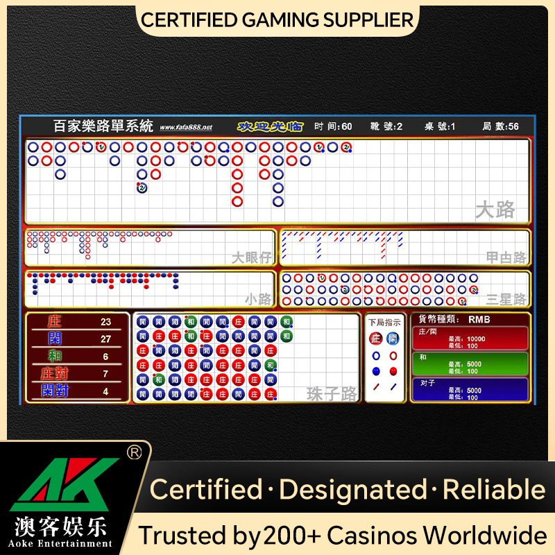 Transform your casino floor with the AOKE Dragon Tiger and Baccarat Electronic Road Sheet System, crafted for professional dealers, high-volume gaming venues, and large-scale international tournaments. This high-precision electronic software pairs seamlessly with standard casino accessories, delivering accurate, real-time tracking and reporting of every game outcome. With RFID security, multilingual support, and fully customizable branding, AOKE provides a modern, reliable solution that elevates operational efficiency and safeguards game integrity.