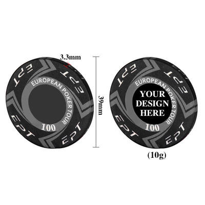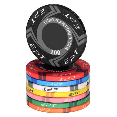 High-quality ceramic poker chips designed for professional casinos, tournaments, and gaming clubs. This 100-piece set features 13 denominations in distinct colors with customizable branding options.