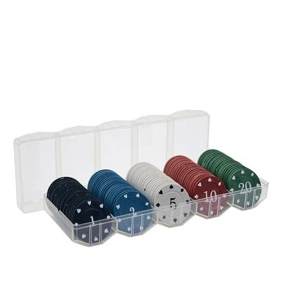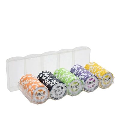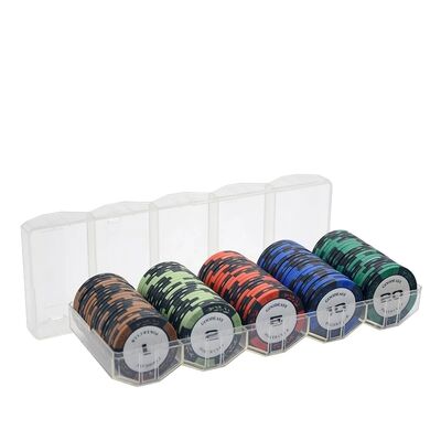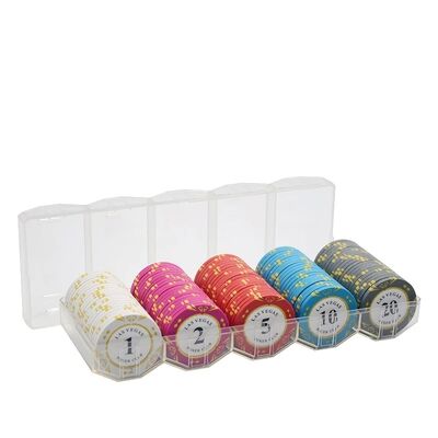 This 100-piece poker chip tray set is designed for organized distribution and storage of casino poker chips in poker rooms, training venues, and tournament environments. The set combines clay composite poker chips with a structured tray or box system, making it suitable as a complete custom poker chip set for operators and distributors.